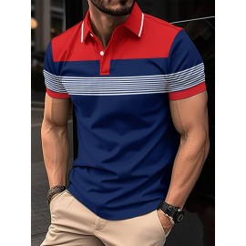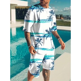 2-piece Men's Casual Summer Vacation Outfit Set, Men's Color Block Short Sleeve T-shirt & Solid Drawstring Shorts With Pockets